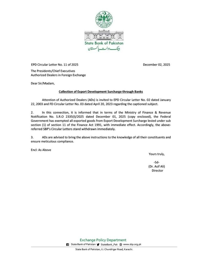 Khurram Schehzad, Advisor to the Finance Minister of Pakistan said the Federal Government has exempted all exported goods from Export Development Surcharge levied under sub section (1) of section 11 of the Finance Act 1991, with immediate effect, see the notification attached by the State Bank of Pakistan.
