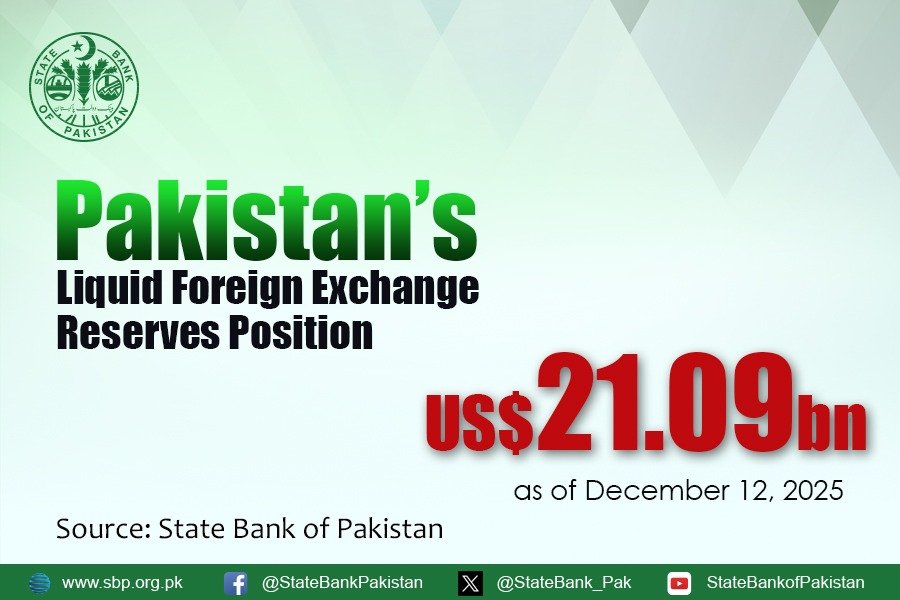 As of 12 December 2025, Pakistan’s total liquid foreign reserves stood at USD 21.09 billion, marking a notable week-on-week increase.