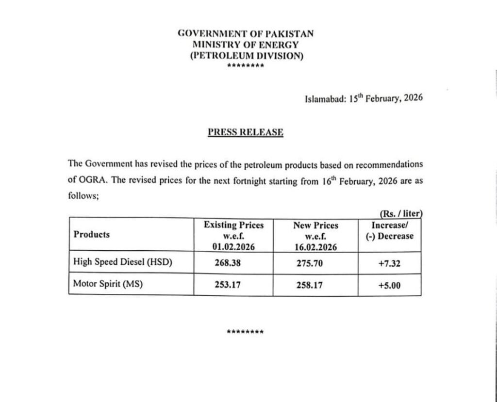 Petroleum Product Prices in Pakistan have once again taken an upward turn, signaling fresh economic ripples across the country. Effective February 16, 2026, the federal government has revised fuel rates for the upcoming fortnight, increasing both petrol and high-speed diesel (HSD) prices.The move comes after recommendations by the Oil and Gas Regulatory Authority (OGRA) and reflects fluctuations in international oil markets during the previous two weeks. While such revisions are routine, the latest hike is expected to have far-reaching consequences for businesses and households alike.