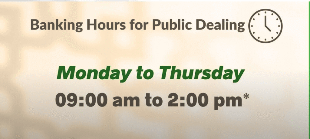 However, it is further advised to observe the following business (banking) hours for public dealing: Monday to Thursday from 09:00 am to 02:00 pm without break whereas on Fridays business (banking) hours for public dealing will be from 09:00 am to 12:30 pm without break.
