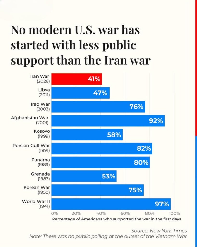 Initial surveys show wide variation in public support. Some polls report approval as low as 27 percent, while others suggest support nearing 50 percent. Even at the higher end, backing for the strikes remains considerably lower than the early days of major wars such as World War II, the Korean War, and the Iraq War.